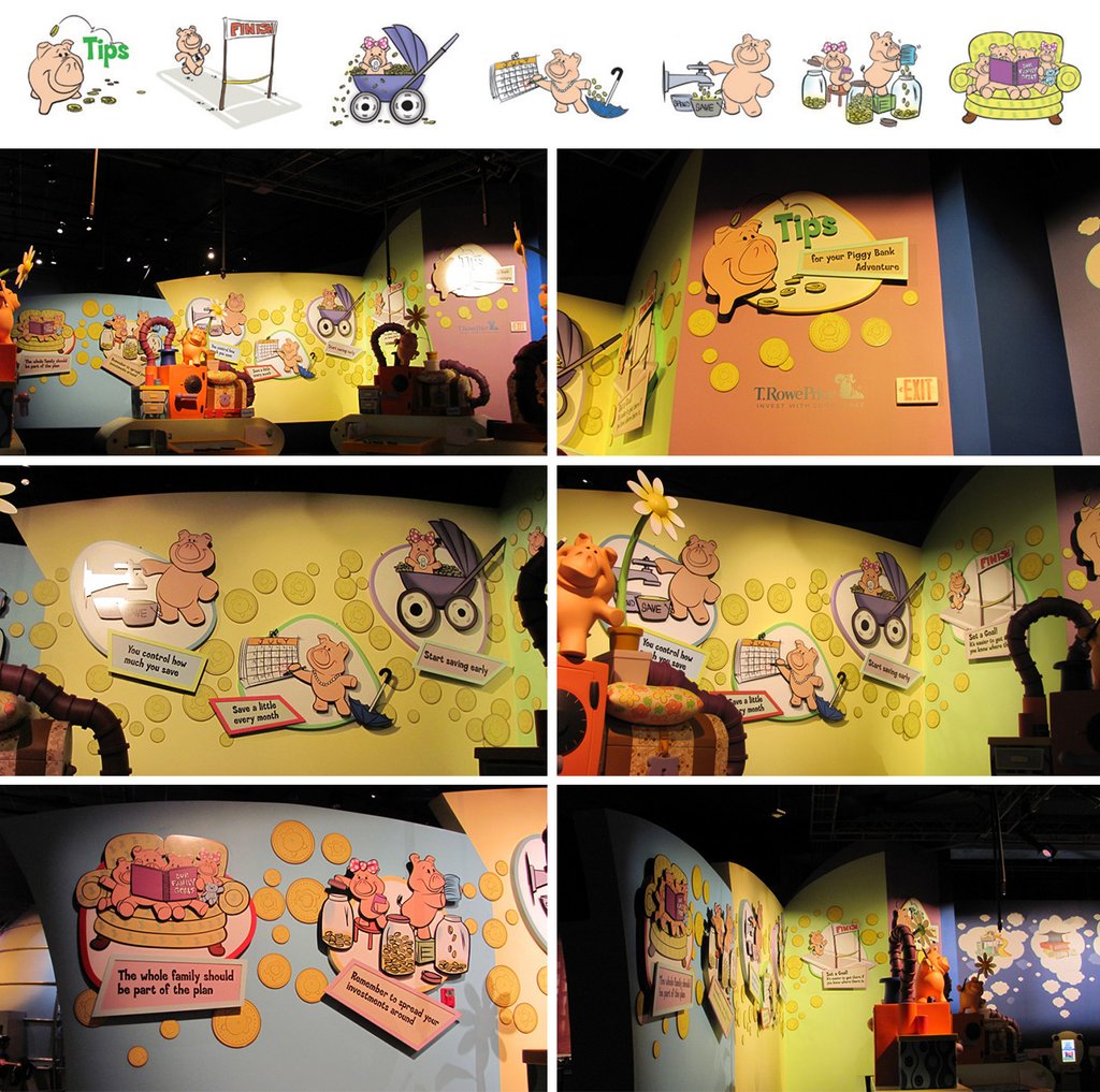Designed and illustrated an exit attraction wall featuring rotating mechanical attachments concealed from view. The wall showcased a short story, emphasizing key points on achieving financial goals while guests exited the experience.
