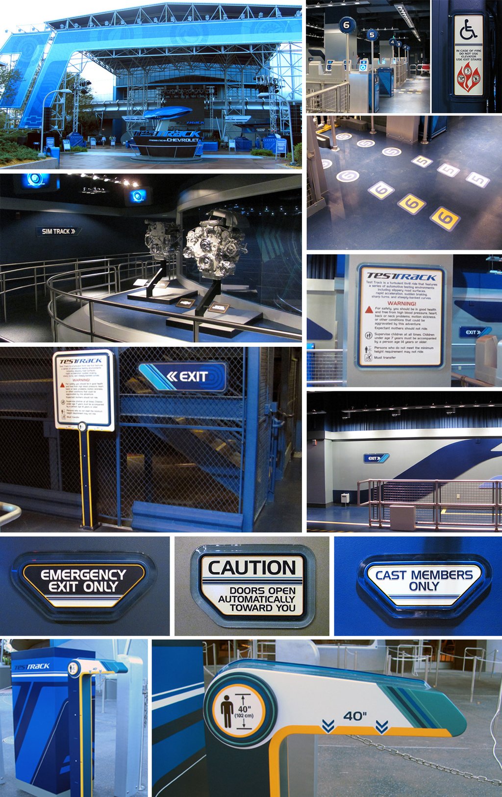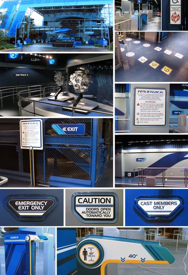 Developed the operational signage package for the Test Track attraction at EPCOT, incorporating metallic finishes, translucent acrylic, and futuristic typography inspired by Chevrolet’s design language. Sponsored by General Motors, the project required innovative problem-solving—most notably pioneering the first use of 3M Controltac with blacklight-reactive ink for the SimCar graphics in 2012.